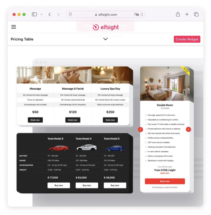 The Pricing Table widget from Elfsight is an embeddable tool that lets you showcase detailed pricing plans (features, tiers, buttons, links) on your Squarespace site. It’s designed to help visitors compare your packages in a clean, easy-to-read way. This widget gives you a ready-made, styled solution rather than building from scratch. It is useful for small-business clients who offer multiple tiers (e.g., Basic, Pro, Premium) or add-ons, a good pricing table helps reduce decision-fatigue and boosts clarity — which supports usability and conversion.