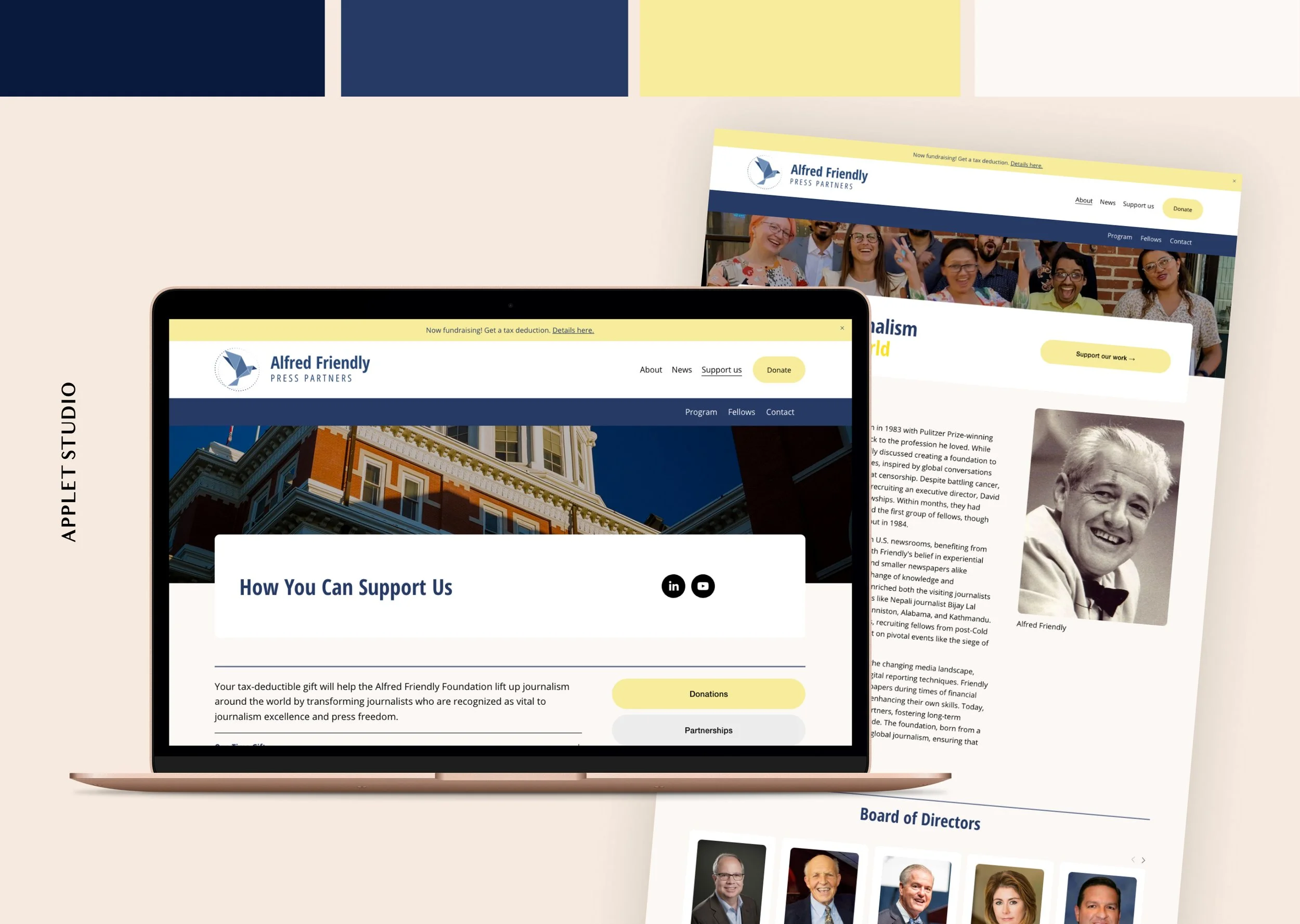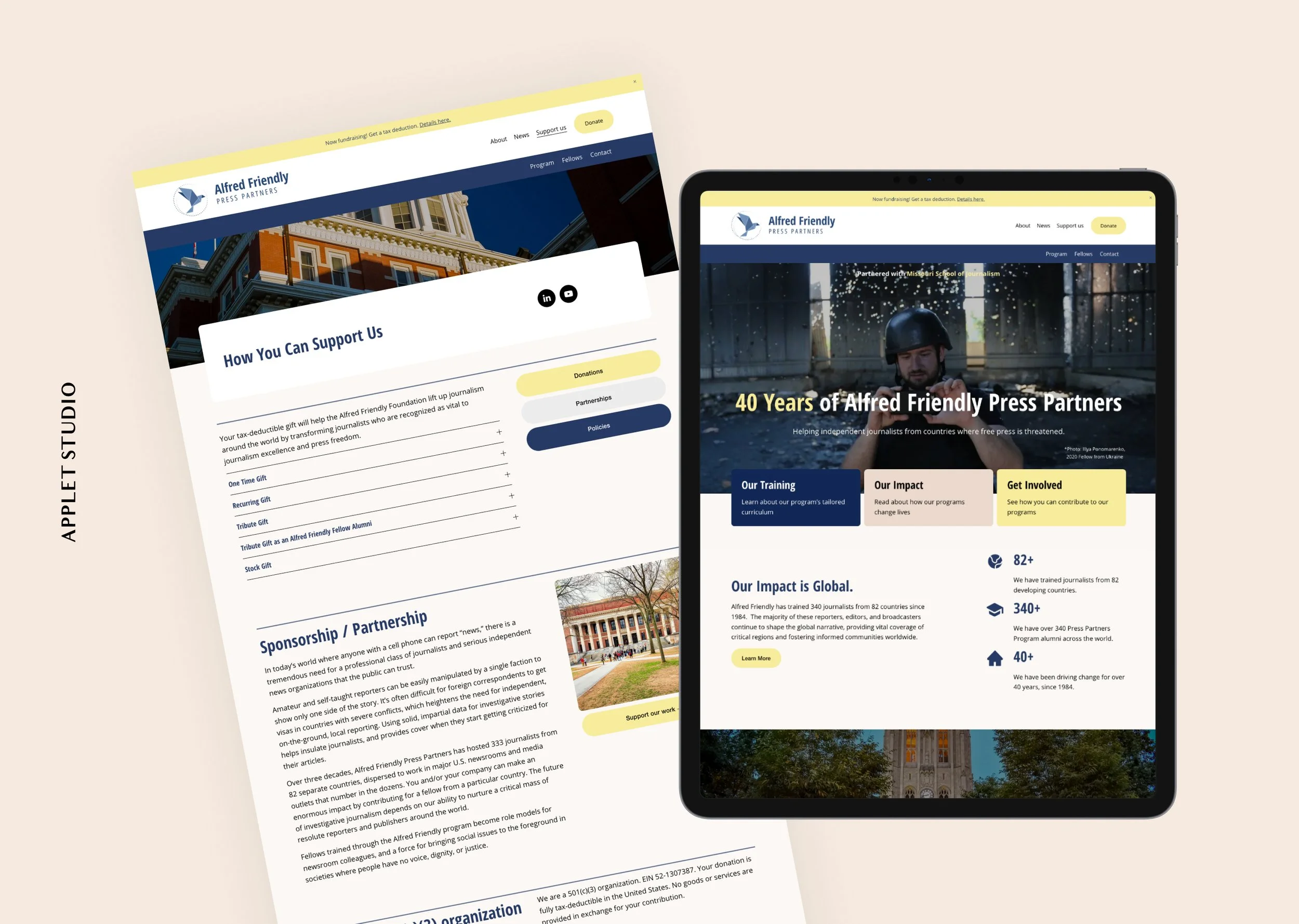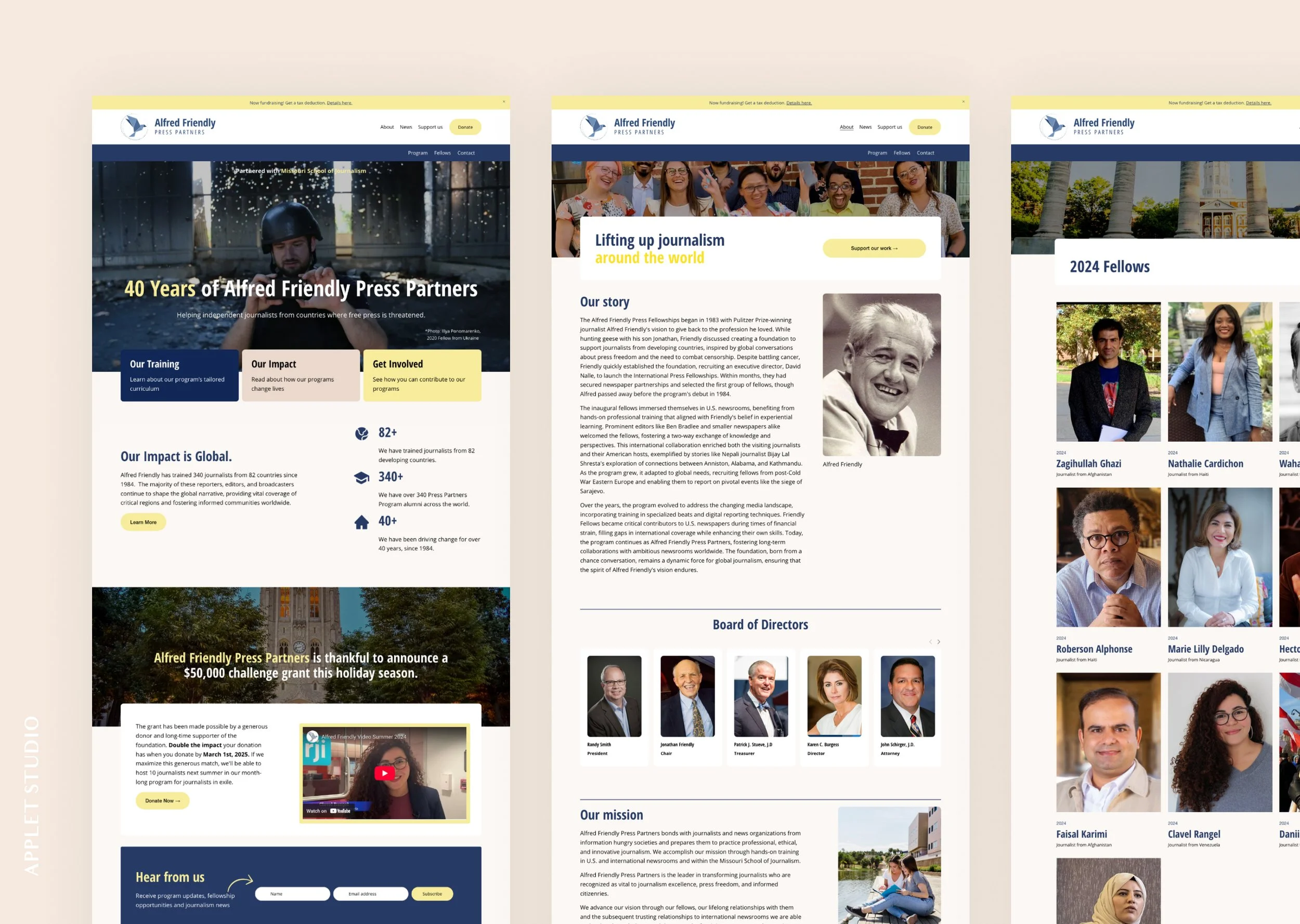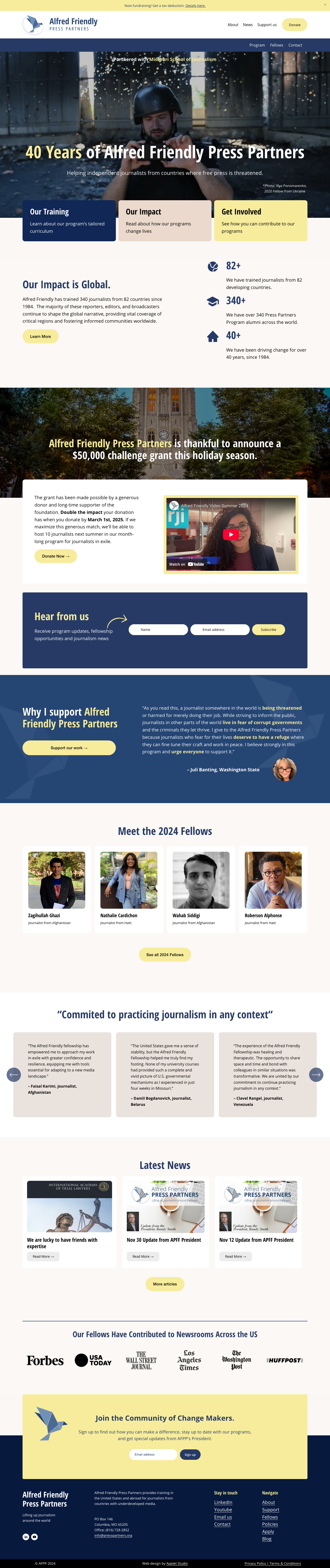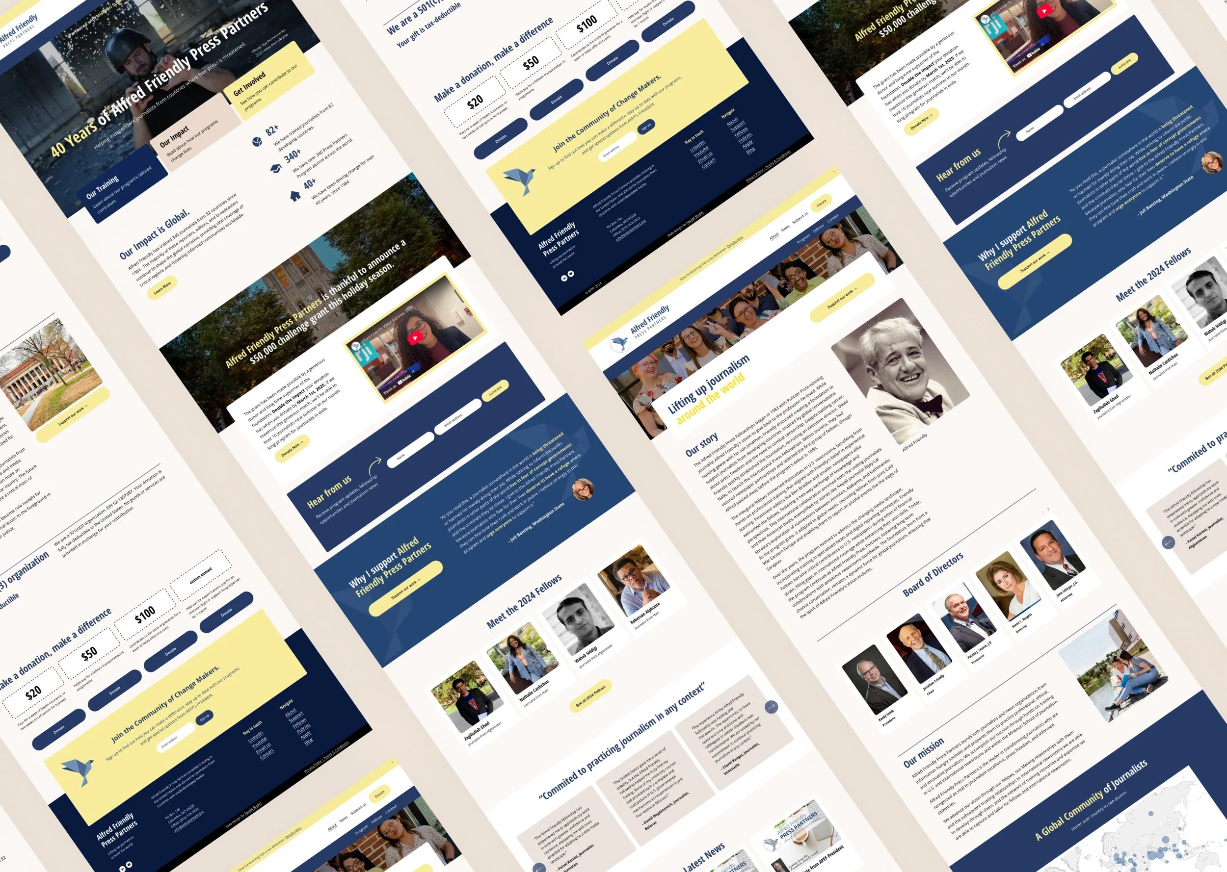 The Alfred Friendly Press Partners website is our custom project from 2025. Having worked as journalists in the past ourselves, we enjoyed designing this website as it was dear to our hearts and minds. The task here was to create a mission-driven design with a clear, content-first structure.